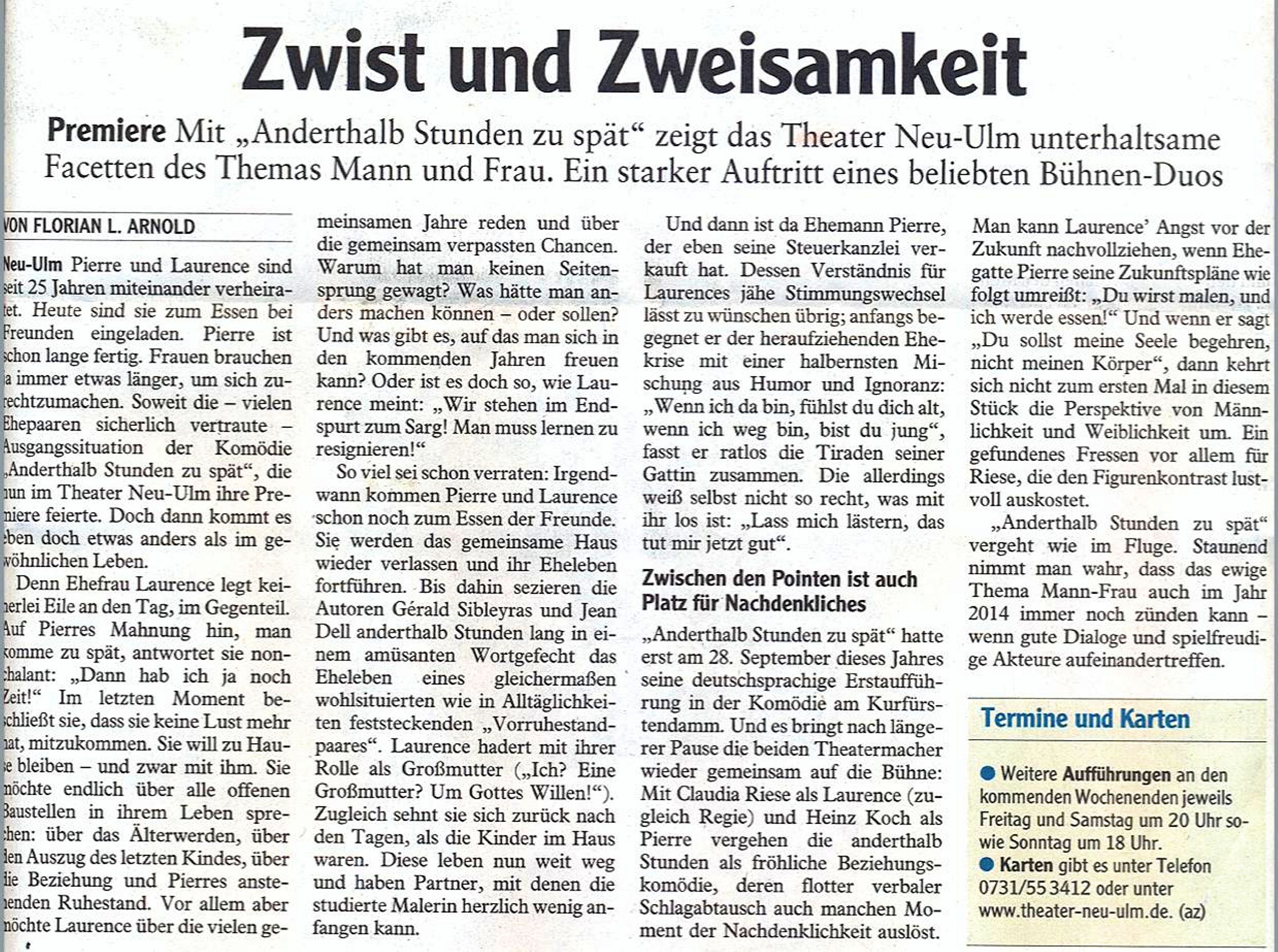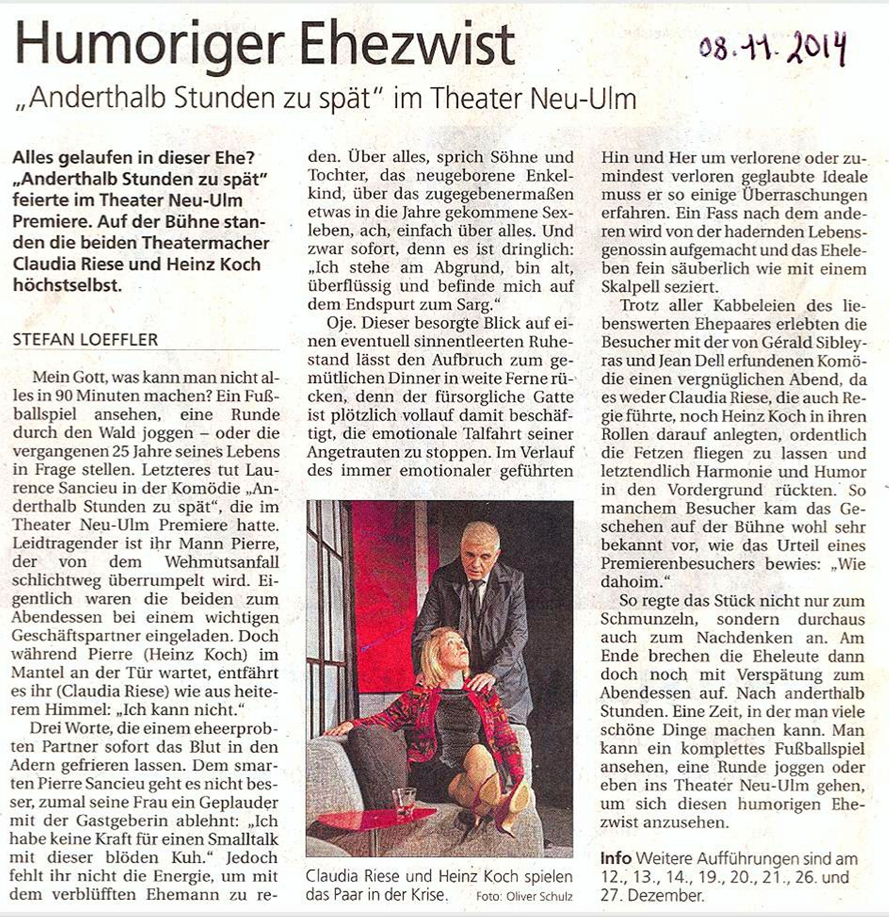 "Typisch Theater Neu-Ulm: Die Riese hat den Koch fest im Griff! Ein toller Abend; eigentlich gar nicht sooo lustig; eher erkenntnisreich. Pflichtkurs für alle mehr als 2 - 3 Jahre zusammengepferchten Paare! Riese und Koch überzeugen wie immer mit ihrer brillanten Schauspielkunst. Danke!"