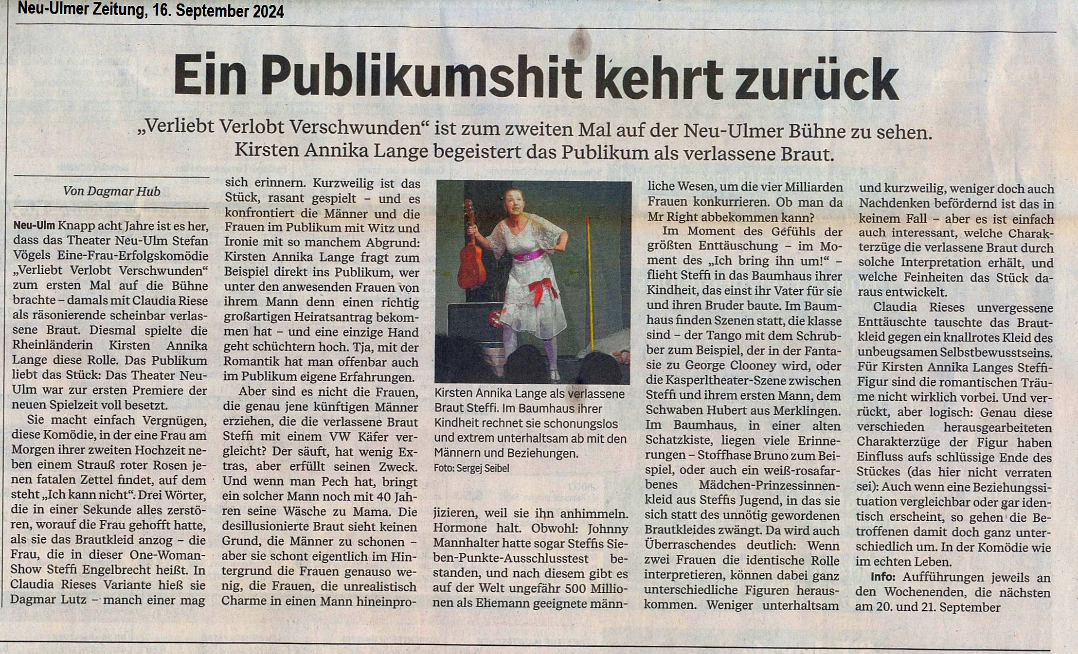 "Für den unterhaltsamen Abend mit Witz und bissiger Ironie gab es bei der Premiere viel Beifall. Die impulsive Claudia Riese verkörpert mühelos