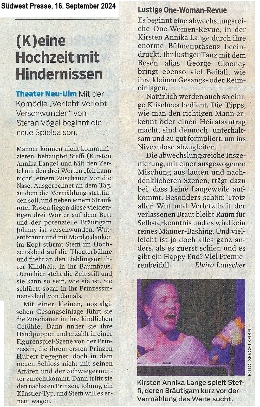 "Wir hatten einen wunderschönen Silvesterabend bei euch mit dem Stück: 'Verliebt, verlobt, verschwunden!' Es war amüsant, witzig und unterhaltsam vorgetragen. Eine wirklich große Leistung von Claudia Riese, den ganzen Abend als 'Alleinunterhalterin' auf der Bühne zu stehen und das Publikum in ihren Bann zu ziehen. Das ist ihr super gelungen! Uns hat es sehr gut gefallen und wir kommen sicher dieses Jahr wieder! Veronika und Thomas aus Filderstadt"