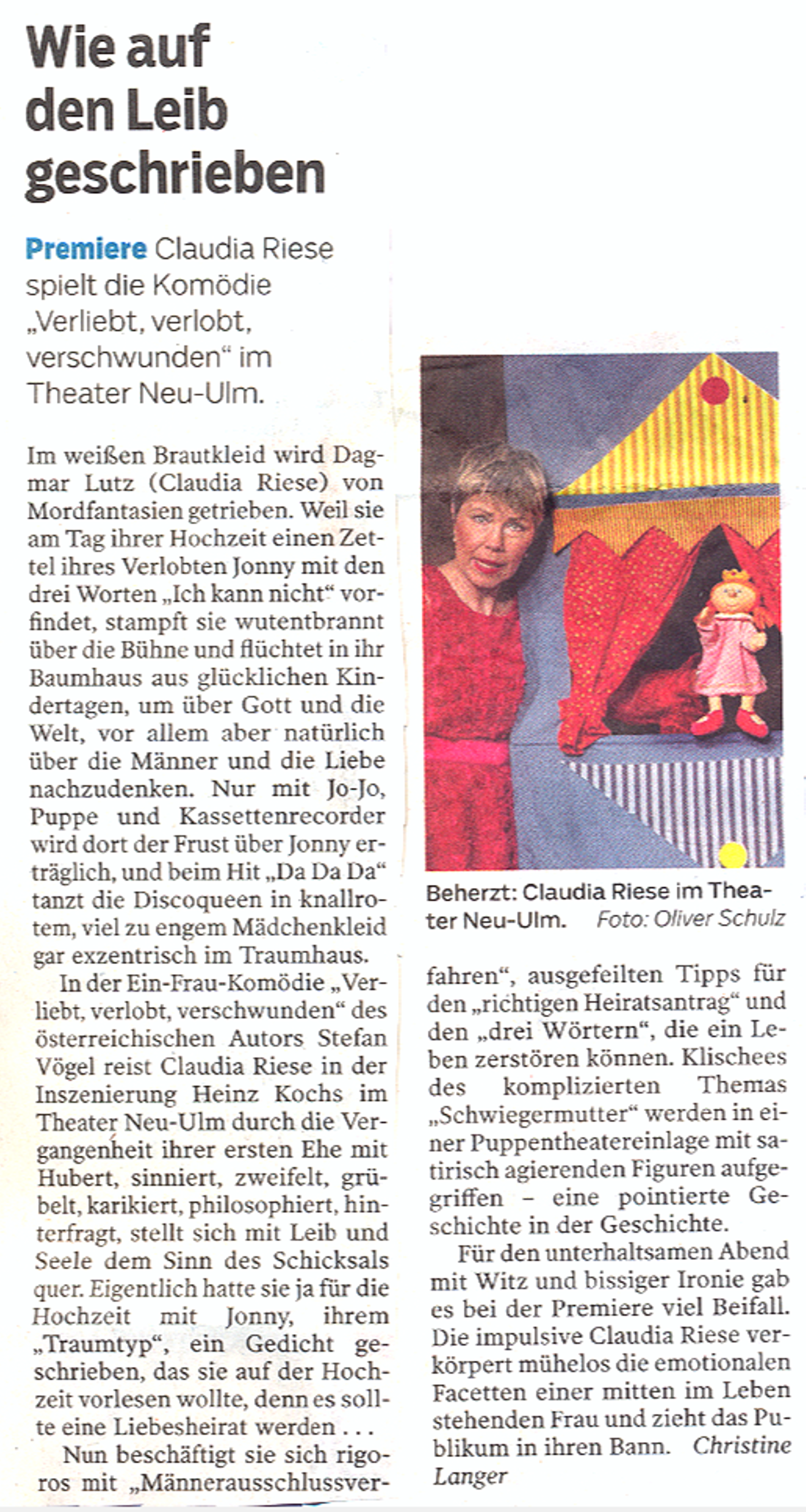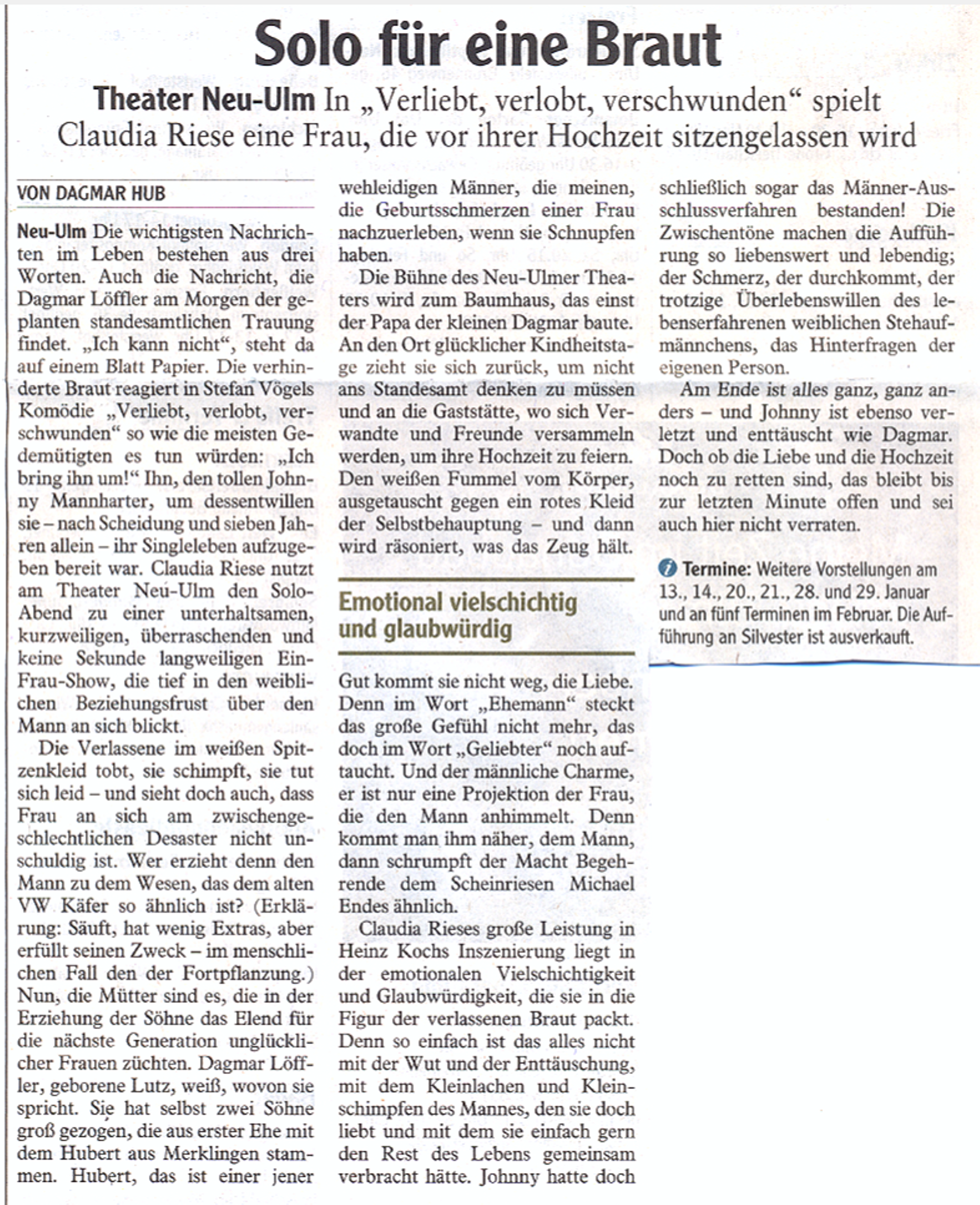 "Claudia Riese nutzt am Theater Neu-Ulm den Solo-Abend zu einer unterhaltsamen, kurzweiligen, überraschenden und keine Sekunde langweiligen Ein-Frau-Show, die tief in den weiblichen Beziehungsfrust über den Mann an sich blickt."
