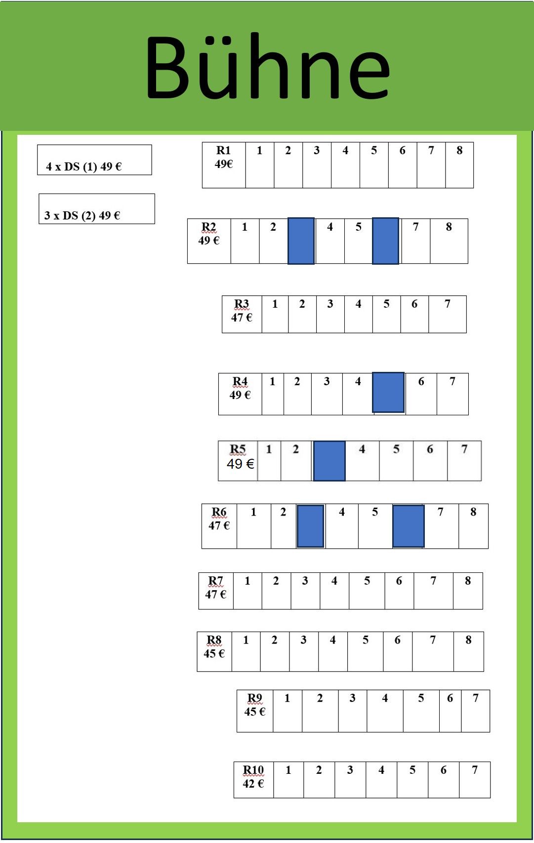 Die blauen Felder markieren Abstelltische für Getränke etc.