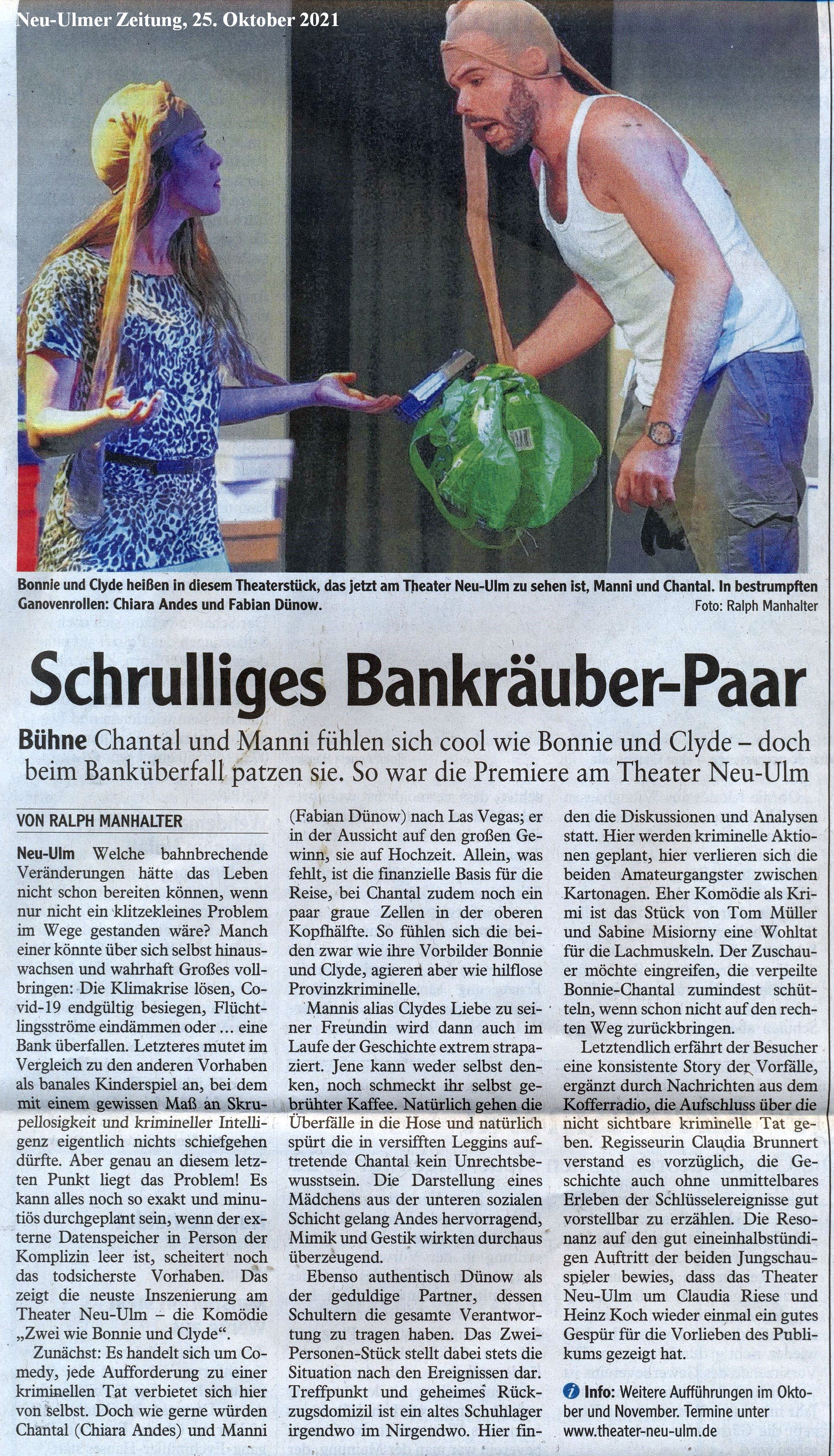 Manni und Chantal alias Bonnie und Clyde träumen vom großen Geld, Heirat in Las Vegas, Rente in Südamerika. Dafür muss aber erst mal eine Bank geknackt werden. Ein Kinderspiel! Zumindest, wenn die Beifahrerin auf der Flucht Straßenkarten lesen könnte und nicht ständig rechts und links verwechselte. Dass sie schließlich in einem ehemaligen Schuhlager landen, ist noch das geringste Übel für die Möchtegern-Ganoven. Viel schlimmer ist, dass Chantal anstatt der Beute die Einkaufstüte einer Bankkundin mitgenommen hat. Also muss ein neuer Versuch gestartet werden.Doch die Tücke liegt im Detail: sprich – in einem enormen Umweg zur Bank, einer plötzlich geballten Konkurrenz weiterer Bankräuber, blickdichten Strumpfmasken und einem leeren Tank. Trotz umfangreicher Generalproben scheitern auch die nächsten Versuche, ans große Geld zu kommen. Dass schließlich zumindest für Chantal ein Happy End in Sicht ist, verdankt sie natürlich eher dem Zufall als ihrer Intelligenz.