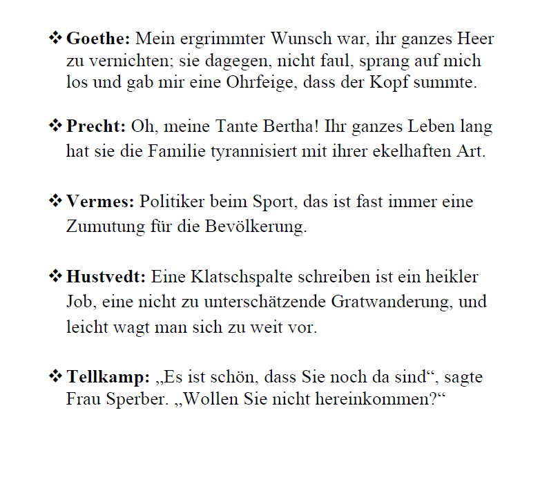 Die aktuellen ersten Sätze siehe unten.Jeder schreibt vier neu-erfundene short-stories und verwendet dabei nur die ersten Sätze aus "Stellen", die den Werken entnommen wurden von Timur Vermes, Richard David Precht, Siri Hustvedt, Uwe Tellkamp und Johann Wolfgang von Goethe.