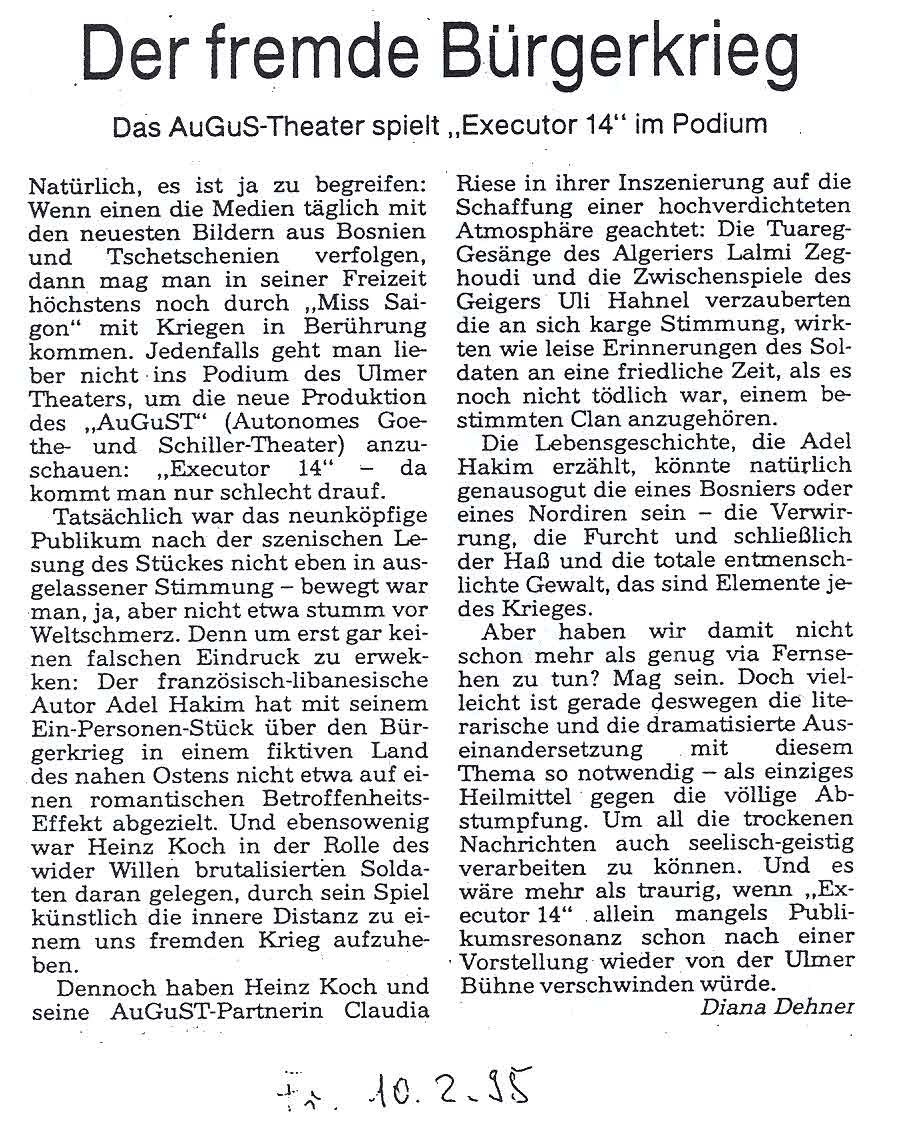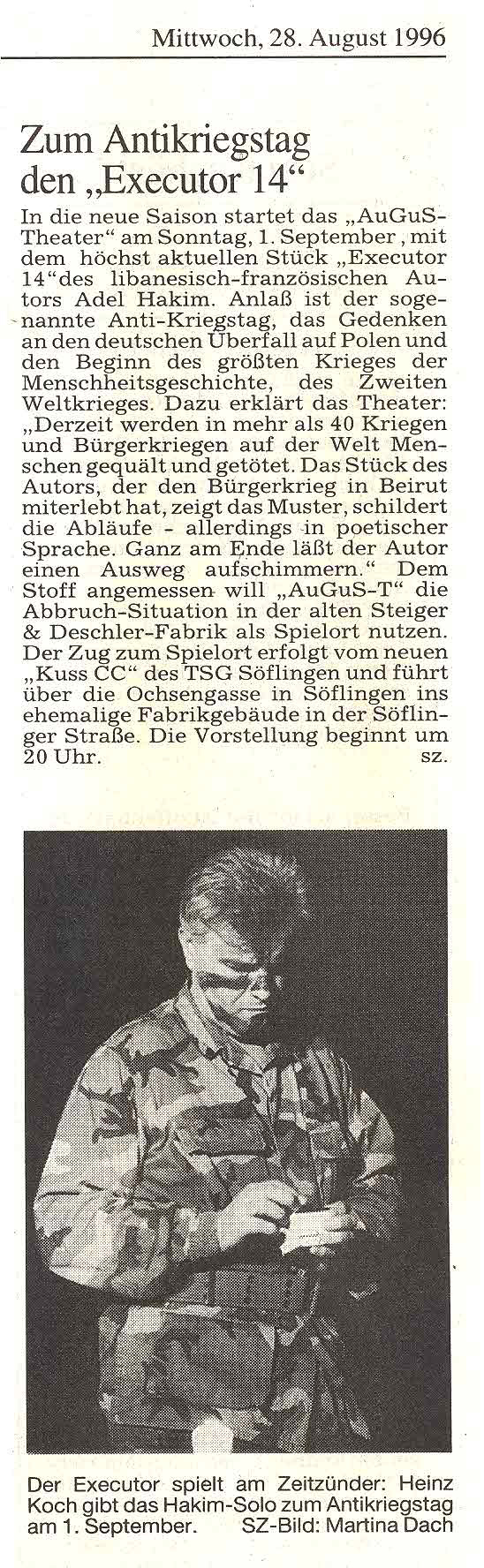 Andererseits trat "Executor 14" in Kooperation mit amnesty interrnational in den aufgelassenen Kasematten der Wiley-Barracks auf, da, wo wenige Jahre zuvor die amerikanischen Pershing II-Raketen gelagert waren. Ein beklemmender Ort, der nicht beheizbar war und wo das Kondenswasser bei ca. 15 Grad minus an den Wänden zu Eiszapfen gefroren war.
