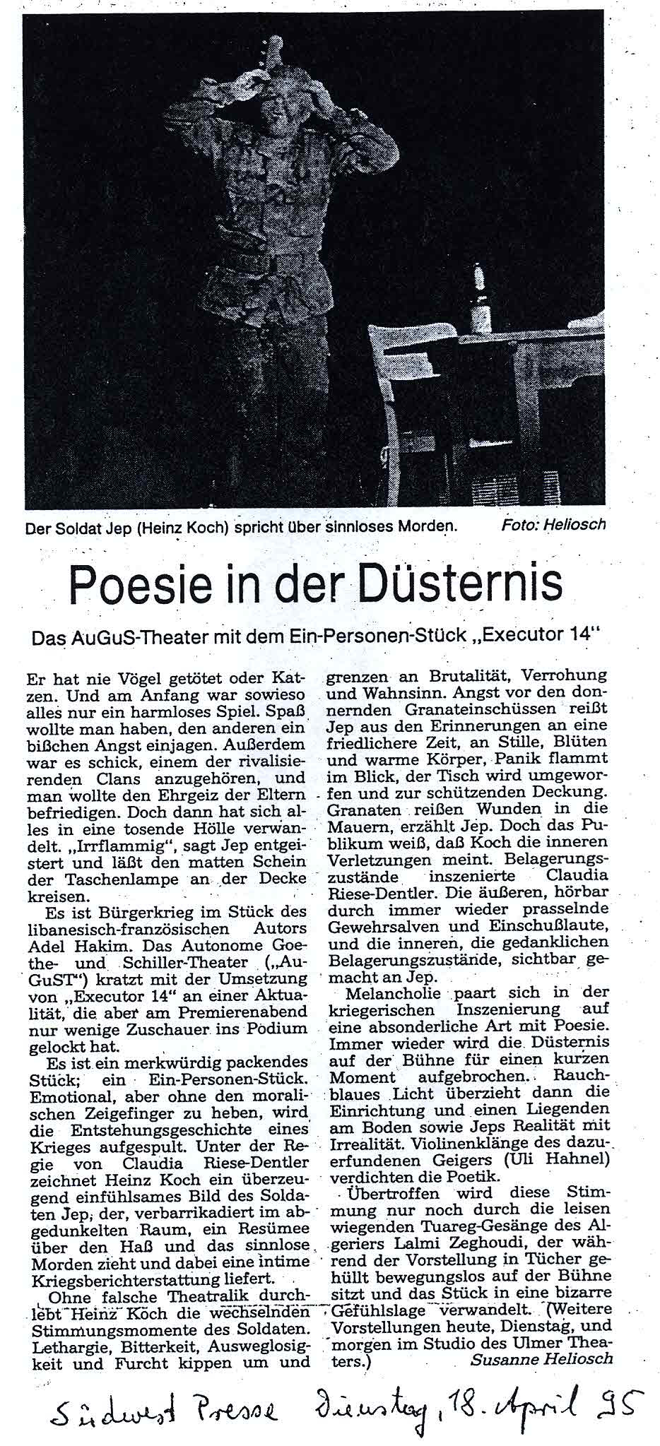 Besondere Inszenierungs-Idee: neben dem die story immer mal wieder unterbrechenden Geiger (Uli Hahnel) die Figur des archaischen Handwerkers (algerischer Gast Lalmi Zeghoudi) einzubauen, der durch originäre Tuareg-Gesänge beeindruckte.