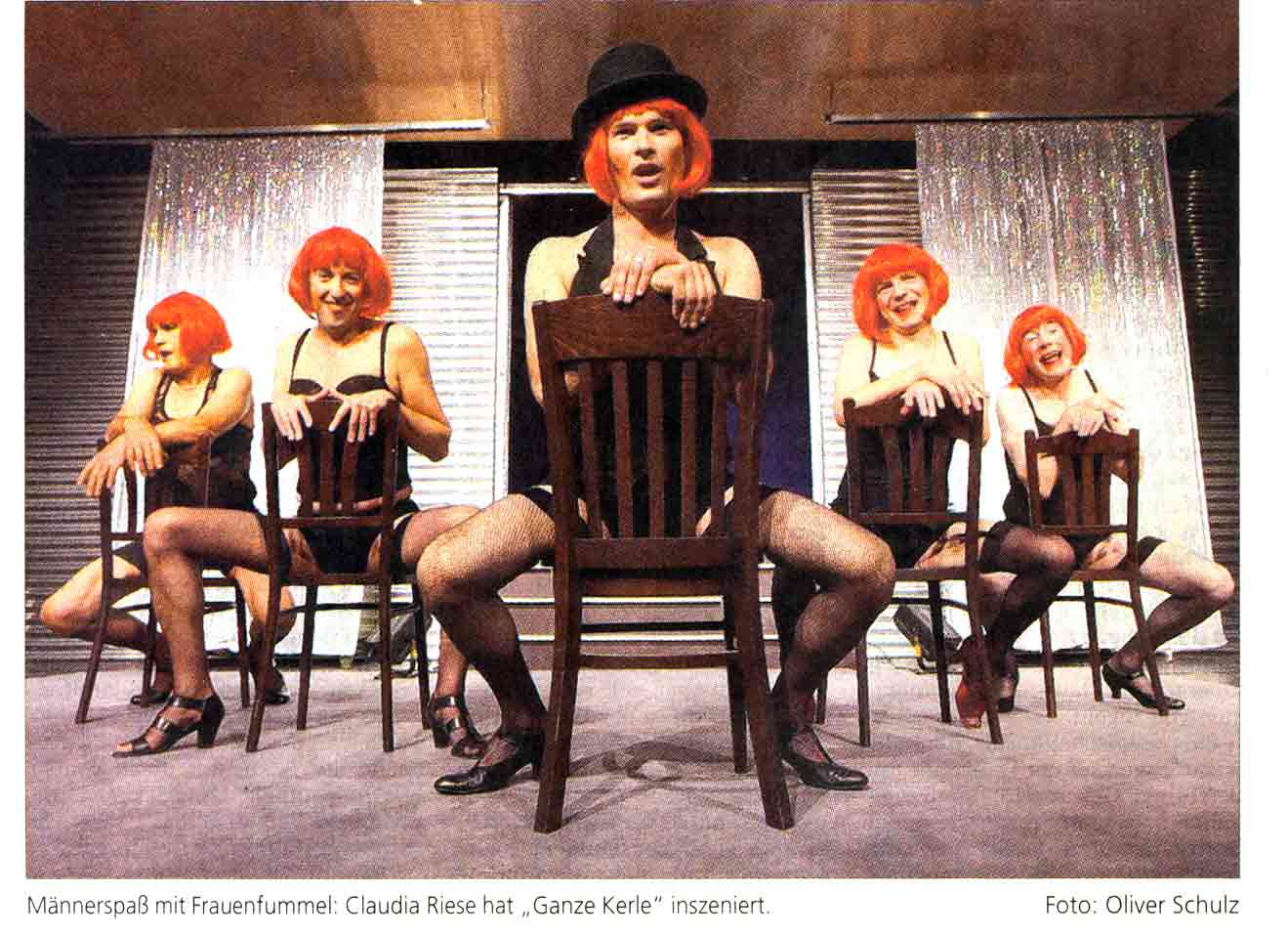 Publikumsstimmen:"Ganze Kerle muss man gesehen haben. Jeder Darsteller ist in seiner Rolle völlig glaubwürdig rübergekommen. Die verwandlungen sind genial. Es war mal wieder ein toller Abend im Augustheater." (schreibt Margot auf "Kulturclub", 28. Dezember 08) "Eine osteuropäische Blondine hat sich köstlich amüsiert" (H. Schweger, 27. Dezember 08) "Von München nach Neu-Ulm - extra wegen 'ganze Kerle'!" (Giana, Uli, Andrea, 27. Dezember 08) "Immer wieder ein großes Vergnügen! Danke für das Lachen, das sooo gut tut! (Uschi G., Stuttgart, 26. Dezember 08) "Wir haben uns köstlich amüsiert. War prima!! Wir kommen wieder! (B. Glück, Weißenhorn, 26. Dezember 08) "Wie geil!!" (anonym, 26. Dezember 08) "Mir hat es super gut gefallen" (Moni Schneider, 20. Dezember 08) "Das Theaterstück hat mir sehr gut gefallen, ich werde wiederkommen" (Kirstin Ammann, 20. Dezember 08) "Wie immer sind wir begeistert!" (die Friedrichs, 19. Dezember 08) "Sagenhaft war das Stück" (anonym, 26. Dezember 08) "Allen, die sich gestern (10. November 08) vom Wetter oder vom Fussball von den 'Ganzen Kerlen' haben abhalten lassen, raten wir, dieses Erlebnis dringend nach zu holen. Umwerfend komisch Sigis erste Gehversuche in Stöckelschuhen, aufrüttelt hilfsbereit Georgs Festhalten an der Sache, trotz seiner schlechten Erfahrungen...(und psst...Enrico...selbst in Frauenkleidern unheimlich schnuggelisch ;-) ). Der absolute Höhepunkt gipftelt jedoch im Duell 'Weiße Rose' gegen 'Französichen Spatz'. Bis bald....liebe Grüße (Anni und Veronika, 11. November 08 per Mail) "Ich bin ja mal gespannt...hab sowas noch nie gesehen, dafür gibt's später dann das Fazit." (später:) "Super! Echt klasse, kann man schon weiter empfehlen!" (anonym, 29. November 08)) "Merci vielmals, zwei Schweizerinnen und ein Hiesiger haben sich köstlich amüsiert und kommen wieder...! 'Lachen ist ja gesund'! Sehr sexy! Und super passende Musik! Sind Männer die schöneren Frauen?" (Helga, Roland, Jolanda, 29. November 08)
