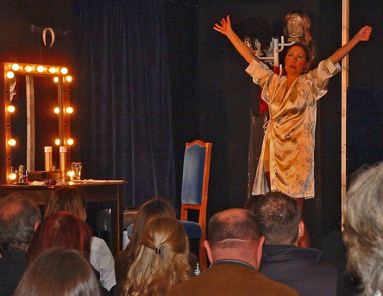 Die Diva und die Sache mit Liebe und SexTheater Neu-Ulm eröffnet jetzt im KonzertsaalVon Redaktionsmitglied Heide von Preußen ![]() Ausverkaufte Vorstellung Am letzten Tag des Oktobers war es soweit: Neu-Ulm besitzt seit diesem Datum ein kleines, feines Zimmertheater im noch nicht ganz fertiggestellten Konzertsaal an der Silcherstraße. Das kleinste Theater Ulms, das Theater Neu-Ulm hat - in Privatinitiative den Sprung über die Donau gewagt. (Hintergründe hat die NUZ bereits ausführlich berichtet.) Und die beiden Initiatoren, Claudia Riese und Heinz Koch, sind auch gleich zur Sache gekommen: "Sex - aber mit Vergnügen", ein neues Stück von Franca Rame, Dario Fo, dem diesjährigen Literaturnobelpreisträger, und Jacopo Fo haben sie ausgewählt und als Ein-Frau-Stück wohlüberlegt auf die Bretter ihres neuen Domizils gebracht. Bereits vor Beginn im Foyer fand sich eine Schar von Theaterfreunden ein, darunter auch Oberbürgermeisterin Dr. Beate Merk, viele Stadträte und einige, die schon jahrelang Fans des Theaters sind. Schauspieler und Regisseur an diesem Abend, Heinz Koch, präsentierte sich im feinen grünen Pailletten-Jackett, begrüßte die Gäste und wiese ihnen den Weg hinauf in den ersten Stock ins Zimmertheater. Kerzen auf Bistrotischen Das "Mädchen für alles", sie stellt sich selbst als Lissie vor (Renate Koch), zündet an den vier Bistrotischchen die Kerzen an, und dann geht's schon in die Vollen. Durch den Spiegel schreitet ein blonder Vamp und singt gekonnt mit dem verruchten Hauch der Barfrau in der Stimme "Sex is a wonderful habit". Bei ihr (Claudia Riese) kann man das getrost unterschreiben, einige Herren konnten anerkennende (allerdings leise) Pfiffe nicht unterdrücken. Gekonnter Abgang mit entsprechendem Hüftschwung, und schwupp ist sie wieder in ihrer Garderobe gelandet, wo Lissie still, aber eifrig wegnimmt und zureicht. Und während sich die Hauptdarstellerin sorgfältig vor dem Spiegel die falschen Wimpern herunternimmt, hört man von einem männlichen Gast gut verständlich: "Jetzt nimmt sie sich auch noch gleich die Zähne raus." Wieder ein Knoten geplatzt, wieder Lachen, wieder das erwünschte Volkstheater, das Rame/Fo seit Jahren erfolgreich praktizieren. Und während der verschiedenen Schminkaktivitäten beginnt die Diva zur vorwiegend nur nickenden Lissie zu sprechen über in die Brüche gegangene Liebesbeziehungen, über Kindheitstraumata, über Aufklärung und Nichtaufklärung, über was wo an an welchem erogenen Körperteil liegt und aktiviert werden könnte. Bei Eva beginnt sie, zum zwar aufgeklärten, aber immer noch mit Akne behafteten Sohn schwenkt sie über, stellt danach wieder fest: "Adam mit seinem Ding war der Teufel, Eva mit ihrer Sache die Bessere." Befreiendes Lachen Kurz, es wird sprachlich in teils komischer, teils auch ein wenig nachdenklicher Weise (Übersetzung stammt von Renate Chotjewitz-Häfner) so alles angesprochen, was Knochen, Fleisch und irgendwelche anderen menschlichen Anziehungskräfte hat. Die Psychologie nicht zu vergessen, manch abwertende Überlegung trifft den Besucher, andere - ha, man weiß Bescheid, ist aufgeklärt - löst befreiendes Lachen aus. Und nicht zu vergessen: Die Anatomie des menschlichen Unterkörpers ist ziemlich genau getroffen. Dazwischen hat die Diva ihre Auftritte, gekonnte, verrucht und überzeugend. Mit am besten vielleicht ist Claudia Riese der heikle Part des Marlene-Dietrich-Auftritts "Ich bin von Kopf bis Fuß auf Liebe eingestellt" gelungen. Bewußt wurde das blonde Perückenhaar vermieden, aber die Sexy-Aufmachung war vom Feinsten, und der Zylinder fehlte auch nicht. Riese hat den schwierigen Durchlauf des Ein-Personen-Stücks,