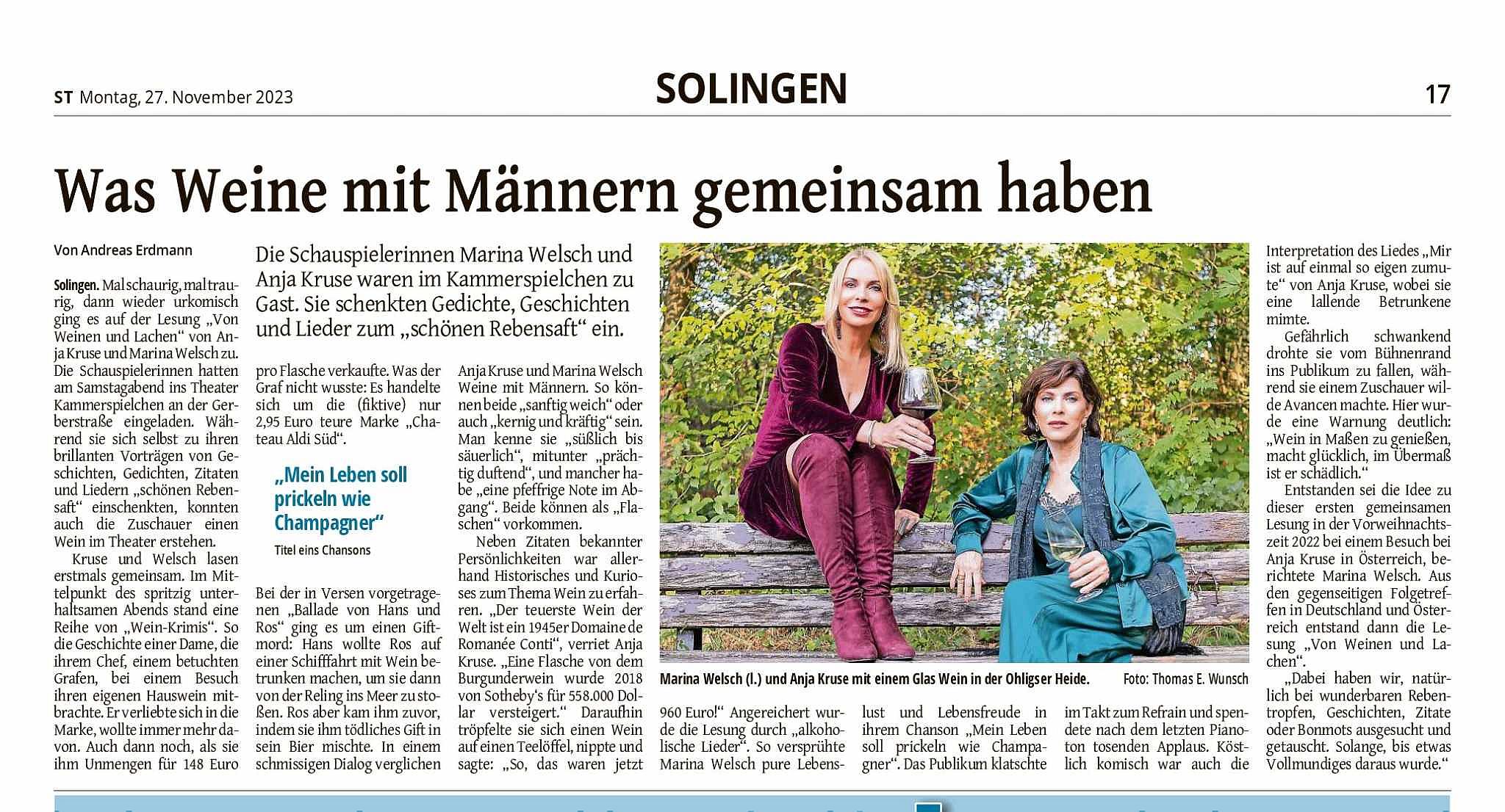 Die von Film und Fernsehen bekannte Schauspielerin Anja Kruse und ihre Künstlerfreundin, die Schauspielerin, Autorin und Malerin Marina Welsch gastieren im Rahmen des Jubiläums-Programms zum 30. Geburtstag des Theater Neu-Ulm mit einem musikalisch-literarischen "Spaziergang" durch die Welt des Weines.