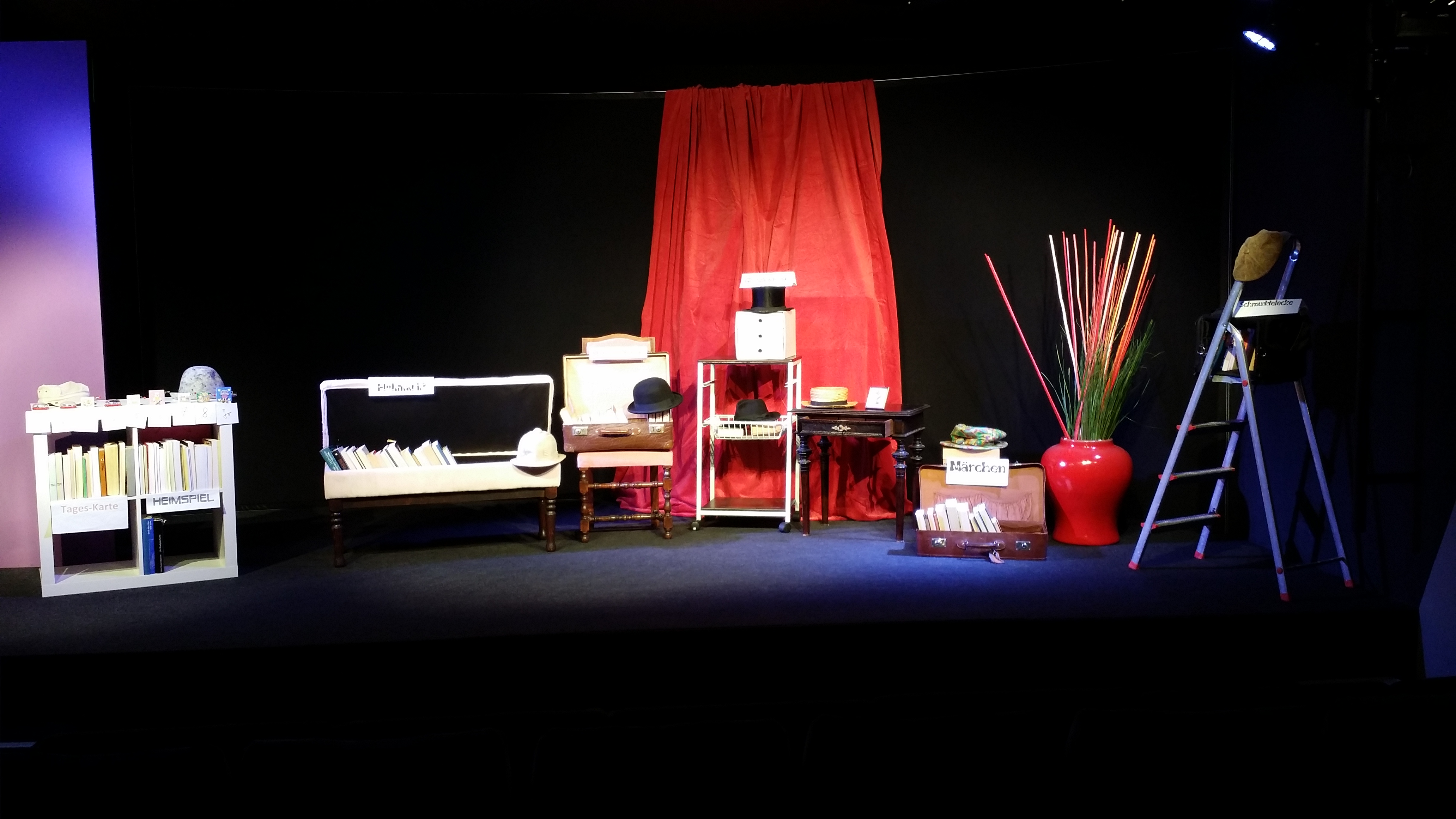 Es gibt auf der Bühne acht verschiedene Bücher-"Schränke" oder Bücher-"Kisten" (oder "Regale" oder "Ecken"), jeweils bestückt mit Lesestoff aus einer bestimmten Literaturgattung: