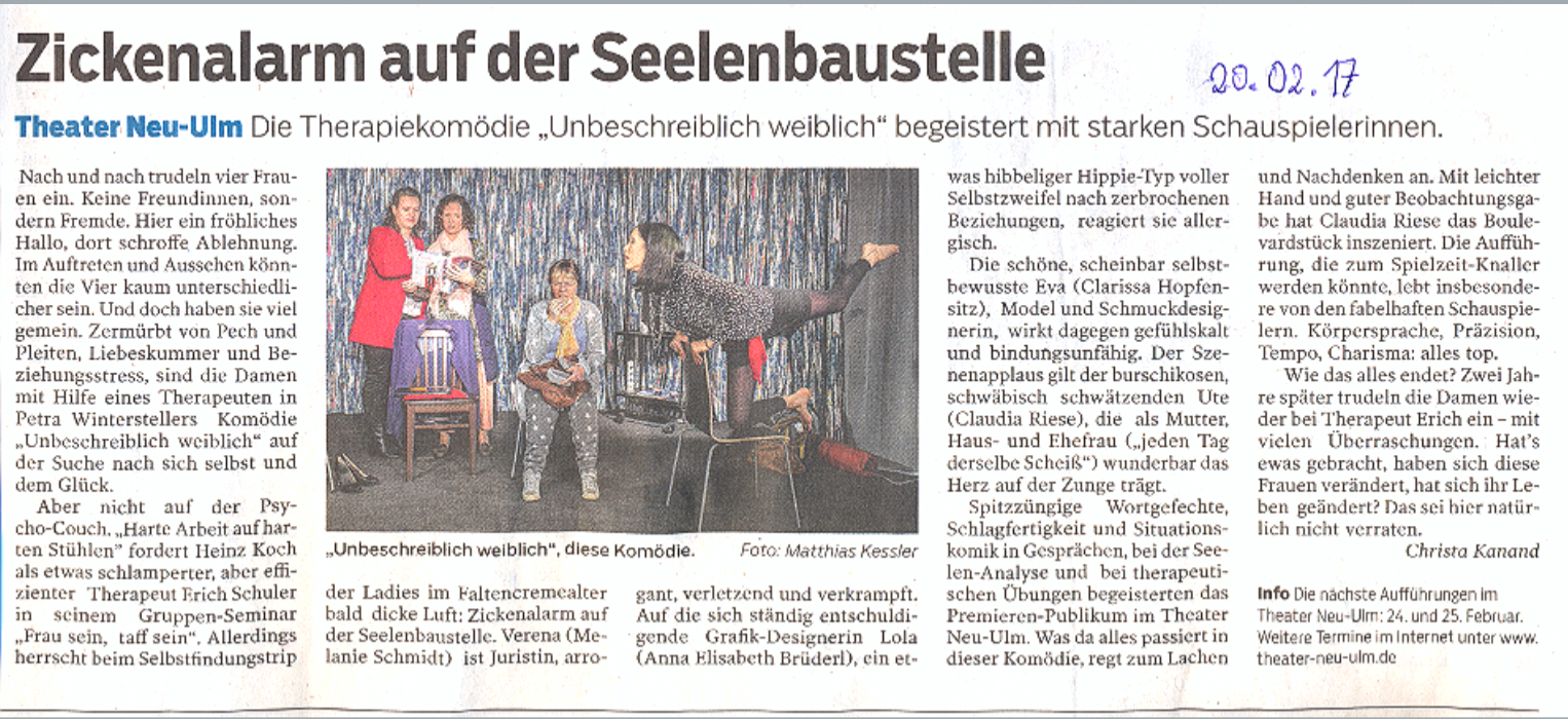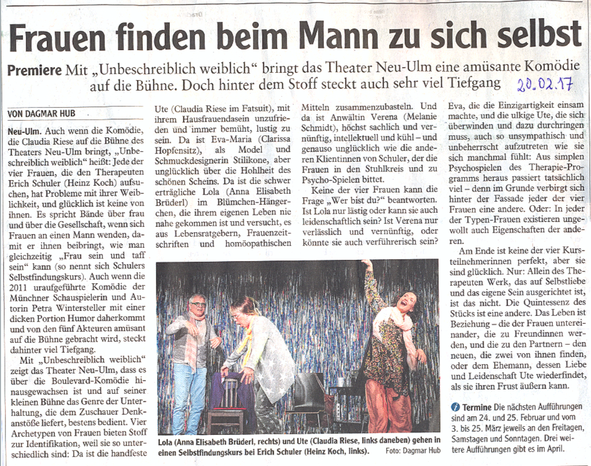 "Das gleichnamige Lustspiel am Theater Neu-Ulm landet auch als Singspiel Volltreffer und ist als szenische Text- und Songmontage ein Netzwerk von Luise Häberle. Diese wiederum ist das Comedy-Alter-Ego von Theaterleiterin, Schauspielerin, Ausstatterin und Autorin Claudia Riese. Als schwäbelnde Witwe Luise fliegen ihr beim gleichermaßen quietschfidelen wie rabenschwarzen Friedhofsketch im Ratschkathl-Tandem mit der kabarettistisch auftrumpfenden Carolin Gutting (Gertrud) die Herzen zu." (Neu-Ulmer Zeitung, "Was Frauen wollen", 02. Dezember 2013