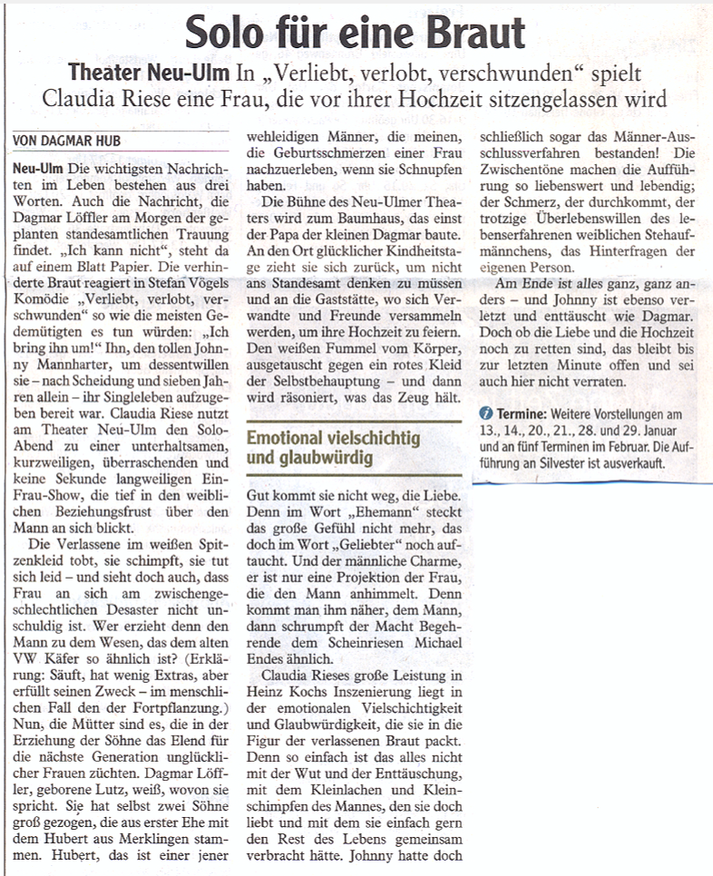 "Claudia Riese nutzt am Theater Neu-Ulm den Solo-Abend zu einer unterhaltsamen, kurzweiligen, überraschenden und keine Sekunde langweiligen Ein-Frau-Show, die tief in den weiblichen Beziehungsfrust über den Mann an sich blickt." Augsburger Allgemeine zu "Verliebt. Verlobt, Verschwunden" am 28. Dezember 2016. (hier die komplette Rezension)